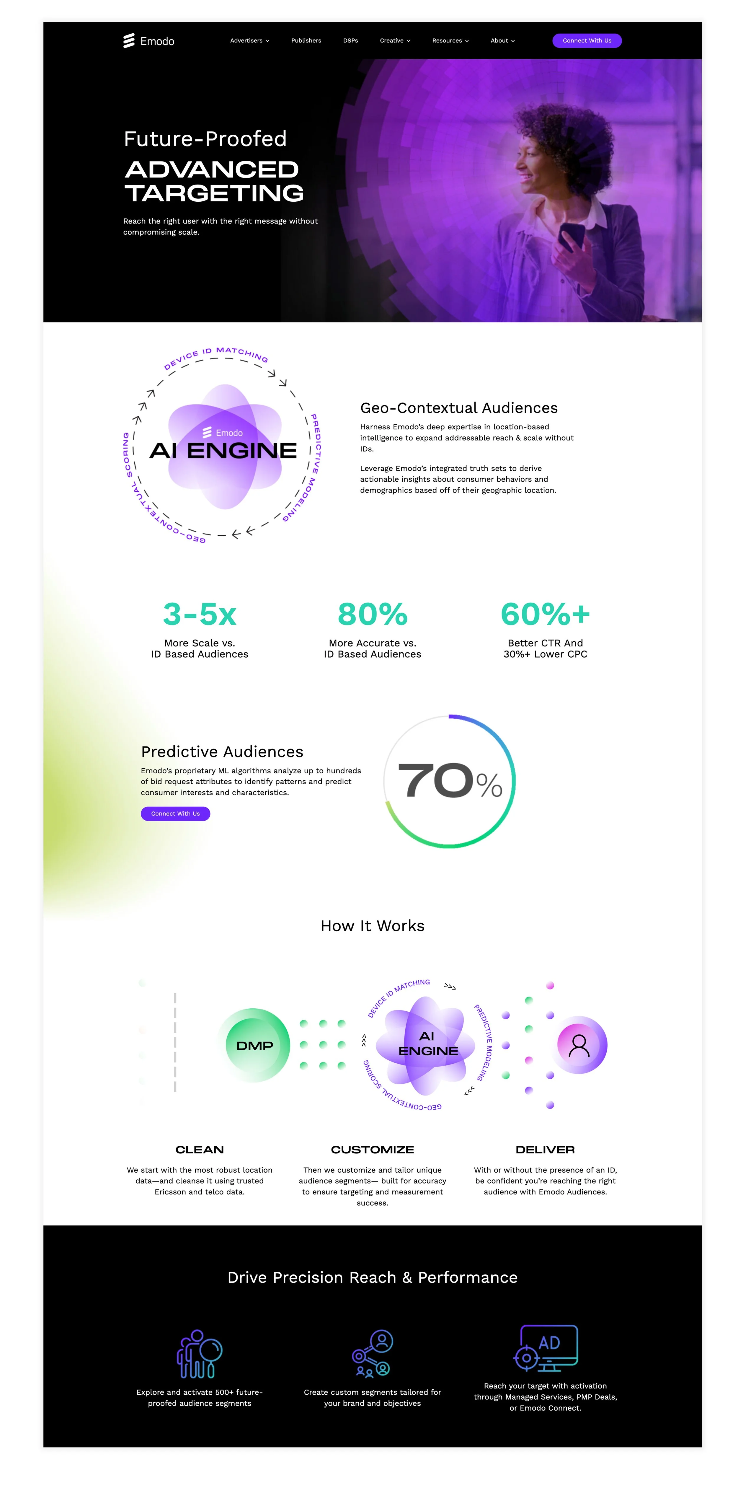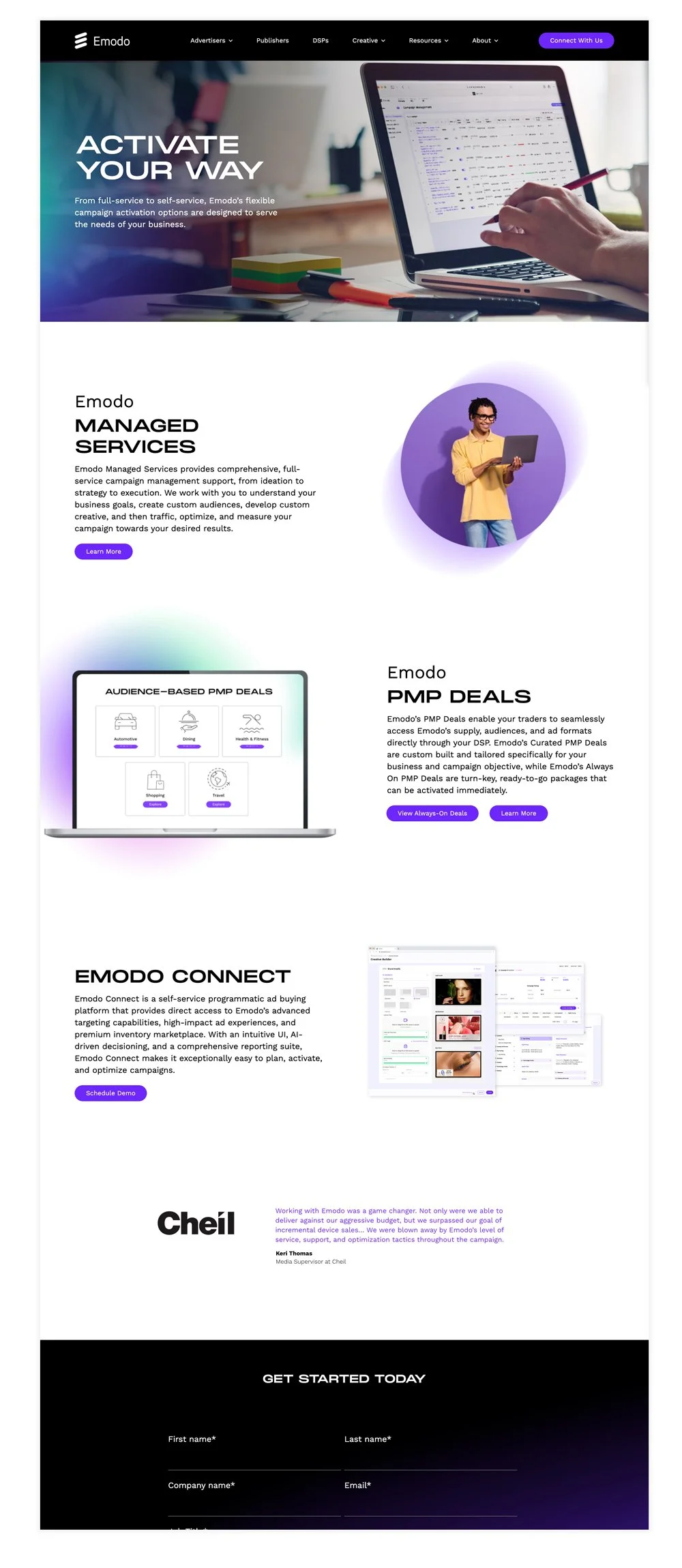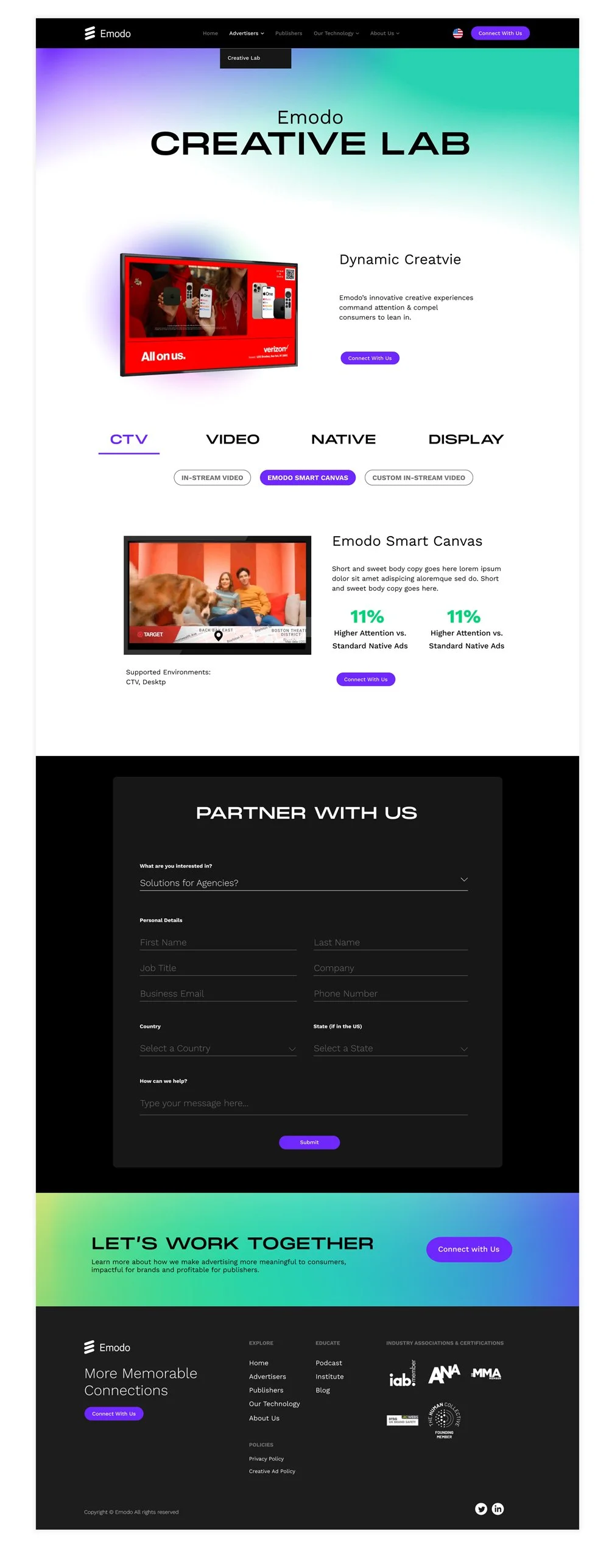 Web & Interactive Design: Spearheaded the redesign of the Emodo website and the creation of interactive Ceros experiences to showcase the brand's new CTV offerings, ensuring a seamless and engaging digital experience for visitors.